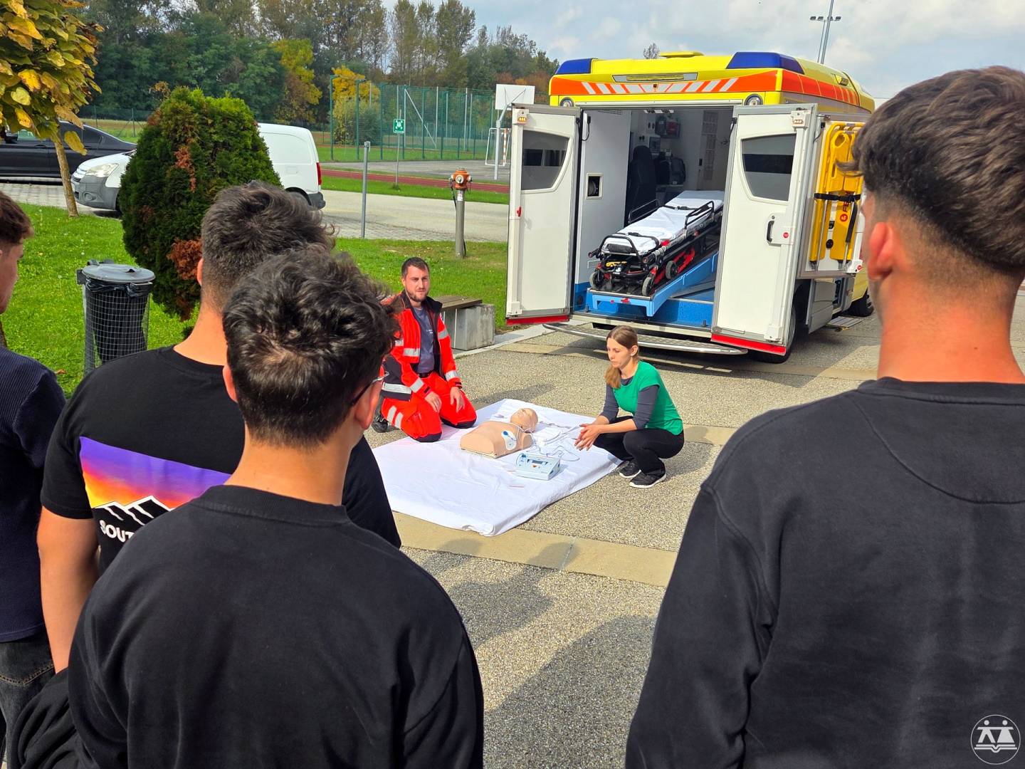 • Az első műhely az automatikus külső defibrillátor (AED) helyes használatának bemutatását és a mentőautó megtekintését tartalmazta, ahol a diákok megismerkedtek a felszereléssel és a mentők munkájával a terepen.
