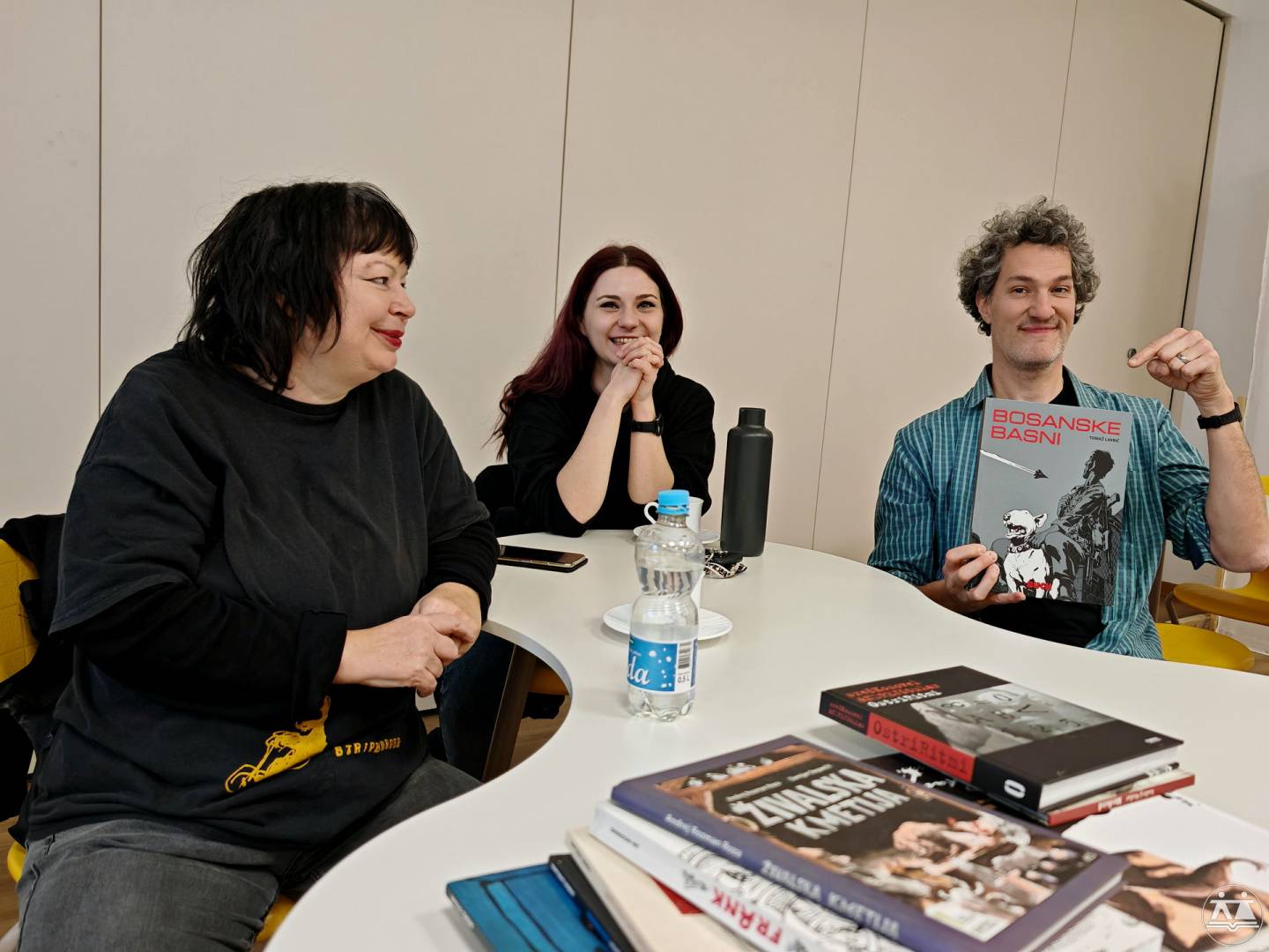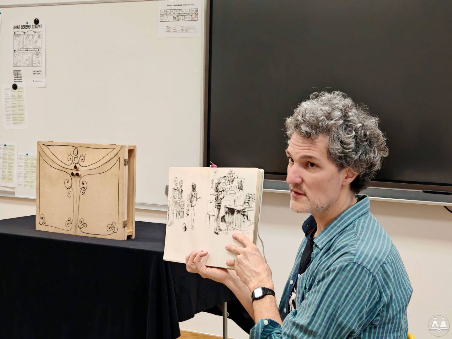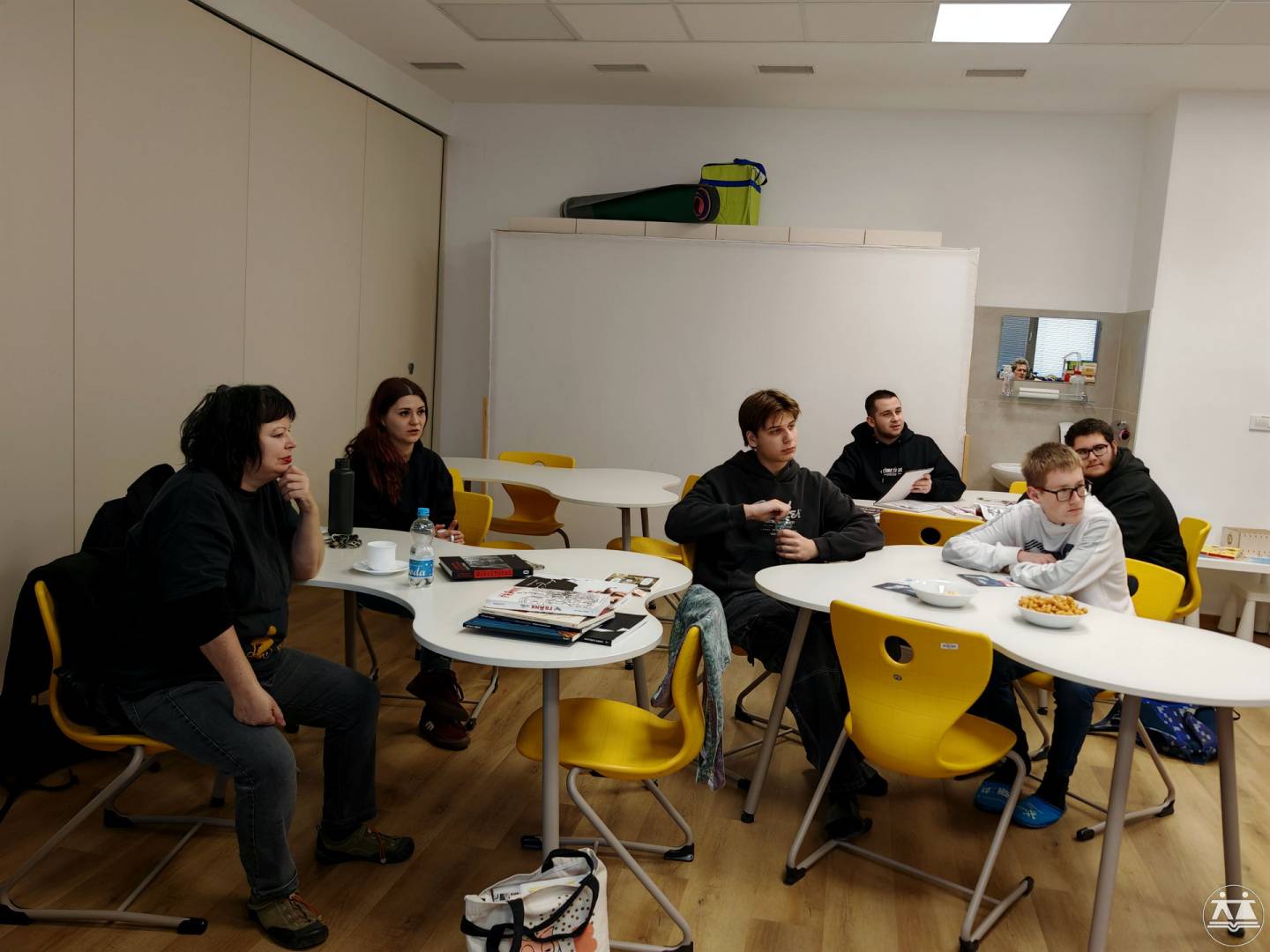 Na stripovskem krožku smo 10. decembra gostili tri izjemne ustvarjalce iz sveta stripa in ilustracije. Obiskali so nas Katja Štesl, stripovska kritičarka in članica uredniške ekipe revije Stripburger, Katerina Mirović, kuratorica in prav tako članica uredništva Stripburgerja, ter Jure Engelsberger, ilustrator, grafični oblikovalec, glasbenik in večplastni umetnik. Katja in Katerina sta dijakom predstavili mednarodni natečaj Živel strip! Živela animacija!, ki spodbuja mlade k ustvarjanju avtorskih stripov in kratkih animacij. Jure je predstavil svoj raznolik ustvarjalni opus, nato pa navdušil še z več nastopi kamišibaja – japonske tehnike pripovedovanja zgodb ob slikah na malem lesenem odru, imenovanem butaj. Obisk je dijakom ponudil neposreden vpogled v sodobno stripovsko ustvarjanje in jih motiviral za lastno delo.