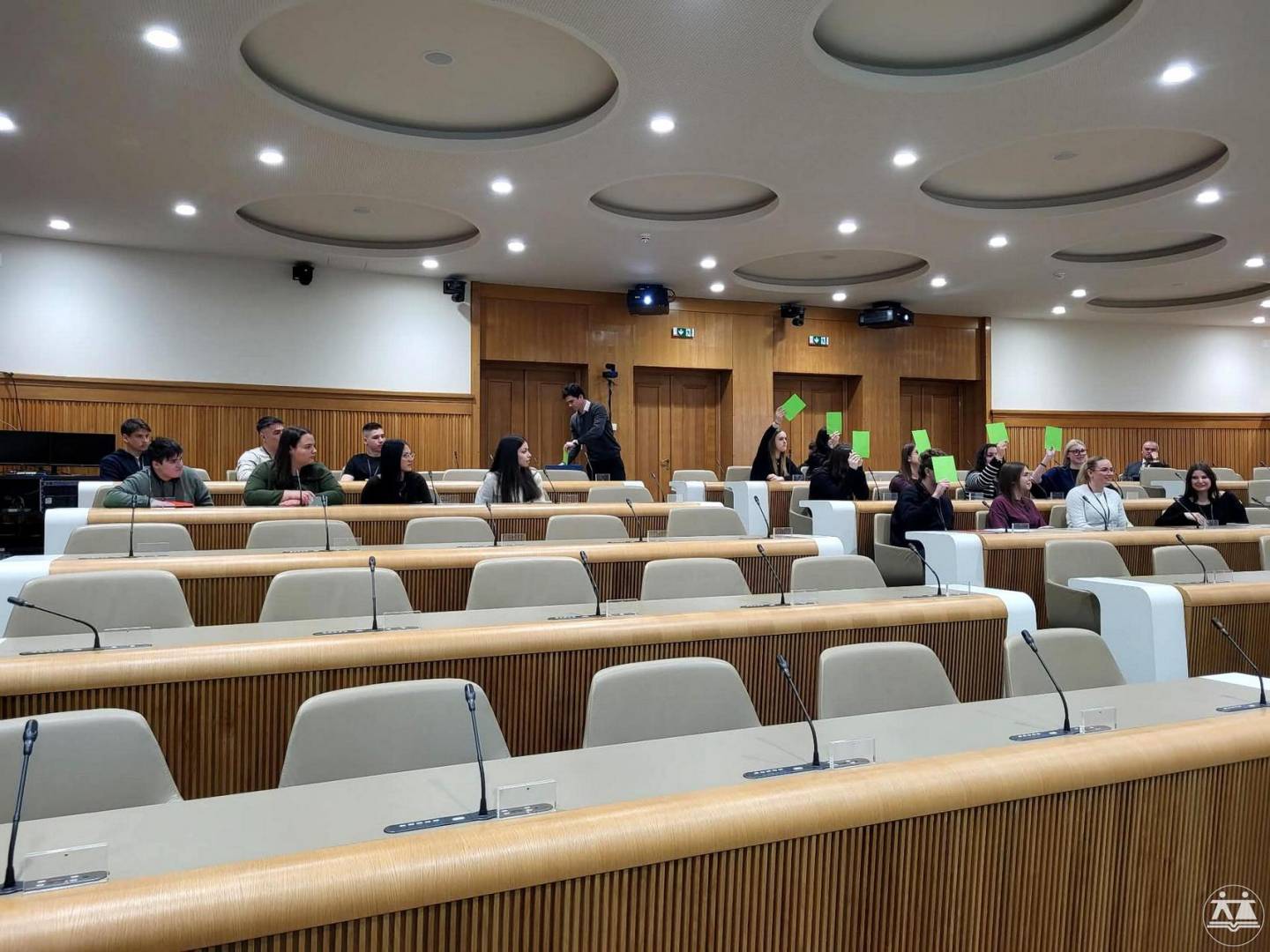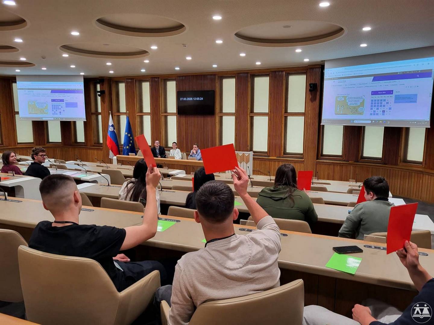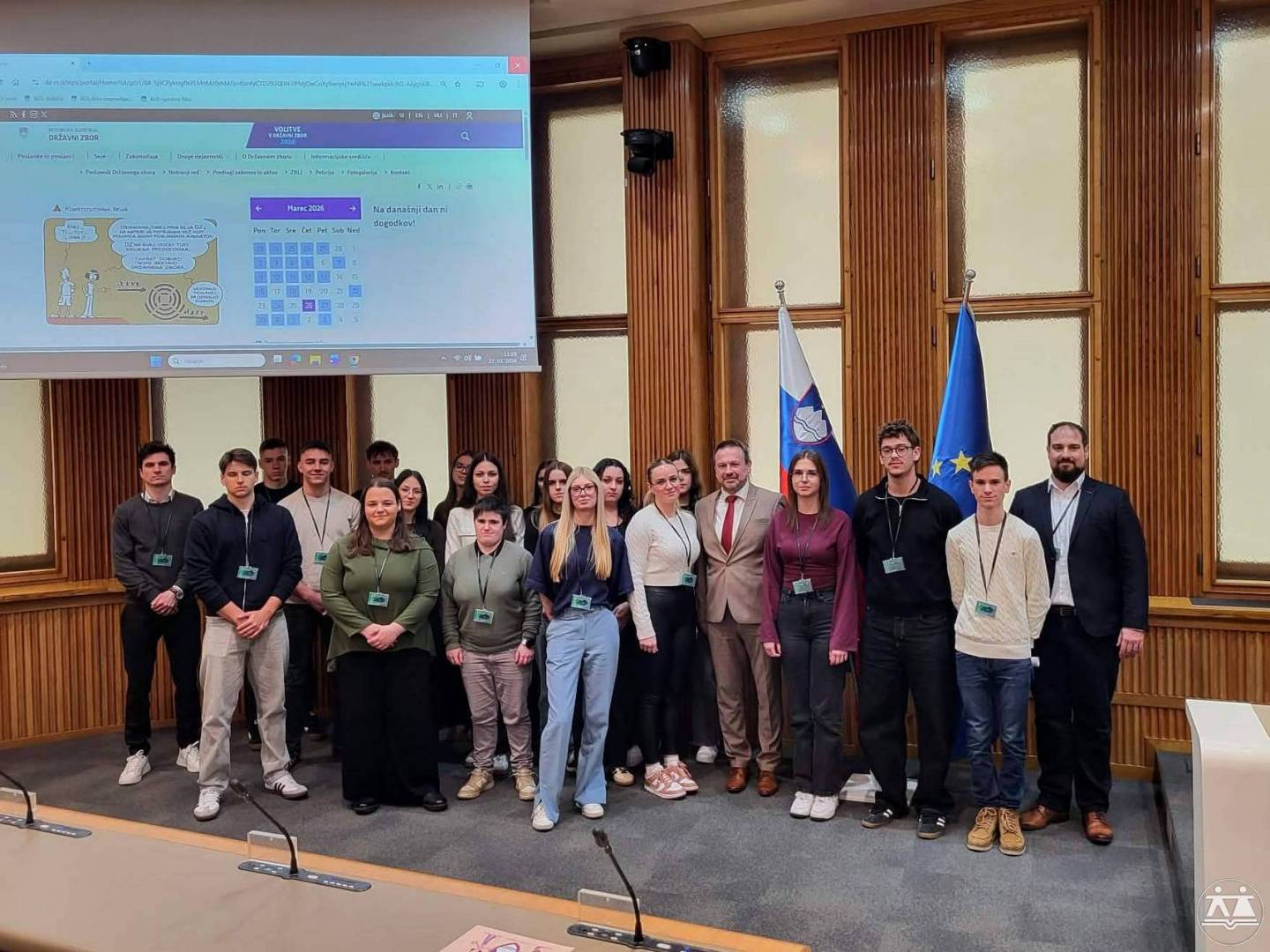 Dijaki 3. a in 3. c so se v petek, 27. marca 2026, v okviru vsebin aktivnega državljanstva udeležili simulacije zakonodajnega postopka v Državnem zboru Republike Slovenije. V sejni dvorani Državnega sveta jih je uvodoma sprejel poslanec madžarske narodne skupnosti Ferenc Horváth, po končani simulaciji pa so si dijaki ogledali še prostore parlamenta.